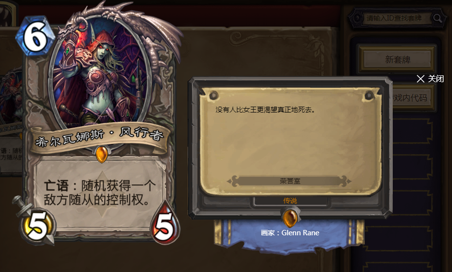 女王虽然被扔进荣誉室了,但是在狂野模式中你依然还是能使用她的是。6费5/5非常标准的身材,亡语触发之后还能控制对方的一个随从。至今在许多中慢速卡组当中,依然有着她的一席之地。反正扔出去了不亏,阵亡了更加不亏,还可能偷对方的一个随从。