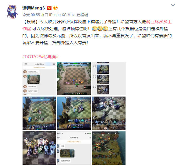 今日凌晨,微博用户@诗诗MengS表示接到很多玩家的投稿和私信,表示自走棋已经出现了外挂,另其他玩家毫无游戏体验。