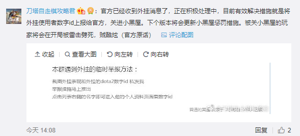 另外据@微博刀塔自走棋攻略君消息,官方正在加紧处理中了,下个版本会更新“小黑屋”系统,使用外挂的玩家将会在开局就被特别“炫酷”的“天雷”劈死。(滑稽),干得好!