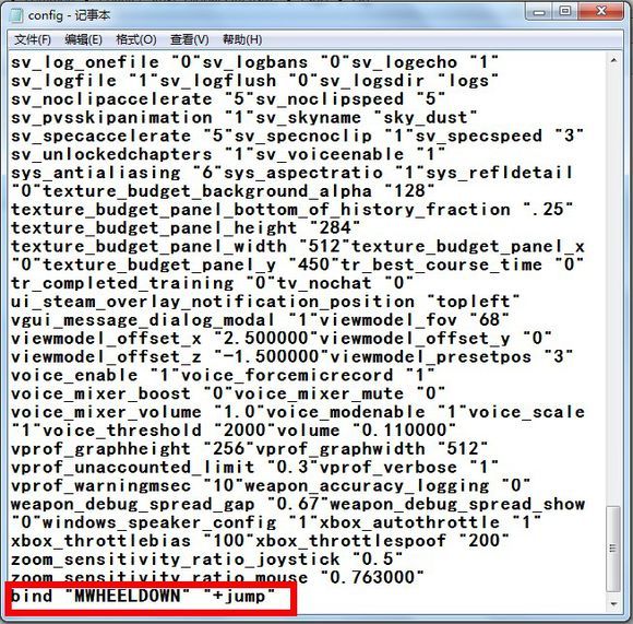 然后,以记事本的方式打开config.cfg在记事本的最后面添加bind "MWHEELDOWN" "+jump" (注意别少复制了引号!)然后保存文件