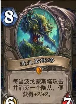 在众多的橙卡之中,波戈蒙斯塔可以算得上是最没有牌面的一位了,居然连名字都没有,英文原名是BIG MONSTER,也就是大怪兽的意思,直接音译过来就是波戈蒙斯塔。再来说一下这个大怪兽的特效,必须击杀一个随从后,才能获得+2+2的BUFF,相较于类拥有似特效的格鲁尔,或者达里乌斯克罗雷,都被完爆的体无完肤。小编认为,一张橙卡的成功与否,首先要看作用,其次要看特点,就连周卓、米尔豪斯等橙卡,虽然非常逗比,但是特点十分明确,但是波戈蒙斯塔这种橙卡,明显就是凑数的橙卡。
