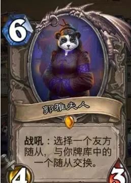 好的橙卡各式各样,差劲的橙卡千篇一律,都是畸形的身材搭配逗比的特效,郭雅夫人正是这样的配置,6费只有4/3的身材,特效也是毫无作用,小编能想到最赚的情况,就是在场上有个大哥随从空血的情况下,使用郭雅夫人,将其洗入牌库,顺便拉出来一个新的大哥随从,但是这种情况只存在于假设,实战中,很难实现。