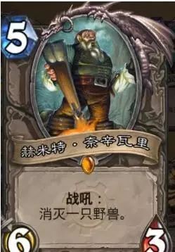 有些熟悉《魔兽世界》的玩家,对于这个角色一定不会陌生,赫米特可是号称艾泽拉斯第一王牌猎人的神枪手,死在他枪下的珍奇异兽数不胜数,在《炉石传说》中的赫米特,虽然完美的继承了自己王牌猎人的角色设定,但是玩家却并不买账,原因就是赫米特的身材和特效都非常的鸡肋,首先针对目标过于单一,效果基本和杀手蟹一个级别,而且野兽属性又是《炉石传说》数量最多的随从,枪毙一只小野兽不赚,大野兽又遥遥无期,所以只能是万年冷板凳。