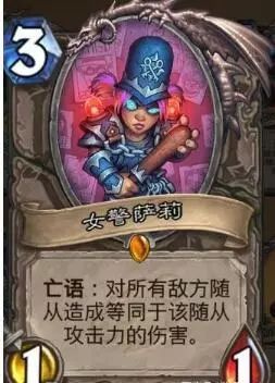 加基森版本推出了很多优质的橙卡,例如毒瘤海盗帕奇斯、青玉体系核心艾雅黑掌、宇宙体系核心牌卡扎库斯,但是女警萨莉却不在其中,3费1/1的身材首先就不过关,其次技能效果更是让人看了一脸懵逼,究竟该如何使用这张卡,到现在也是《炉石传说》中的未解之谜,想要当成AOE使用,就必须进行额外的BUFF投资,这样显然不划算,想要当做随从进行站场,身材底子实在堪忧。
