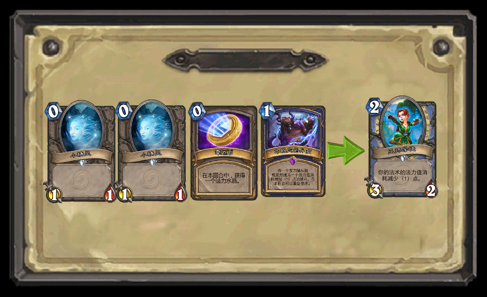 对面:吉安娜 自己:瓦莉拉。瓦莉拉先手起始手牌:伺机待发、伺机待发、搜索。第一回合抽到假币,伺机待发搜索获得鲁莽实验,1费伺机待发鲁莽实验召唤哀绿1号和2号,搜索获得不稳定的传送门,传送门出哀绿3号,搜索出不稳定的传送门,传送门出哀绿4号,搜索出不稳定的传送门,传送门出嗜法者,嗜法者出不稳定的异变,搜索获得远古雕文,远古雕文出迈拉的不稳定元素,过光牌库,然后不稳定的异变将哀绿1号变成机械克苏恩,搜索出不稳定的传送门,传送门出嗜法者,嗜法者出大灾变,假币,大灾变