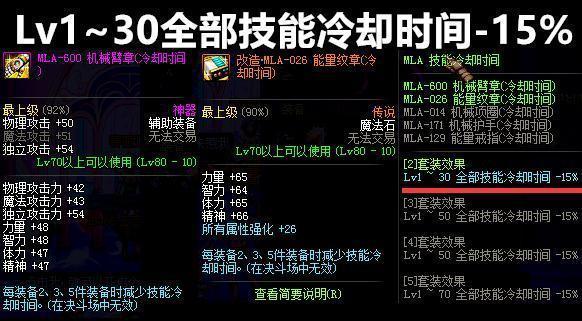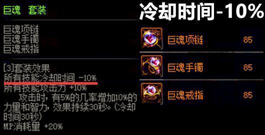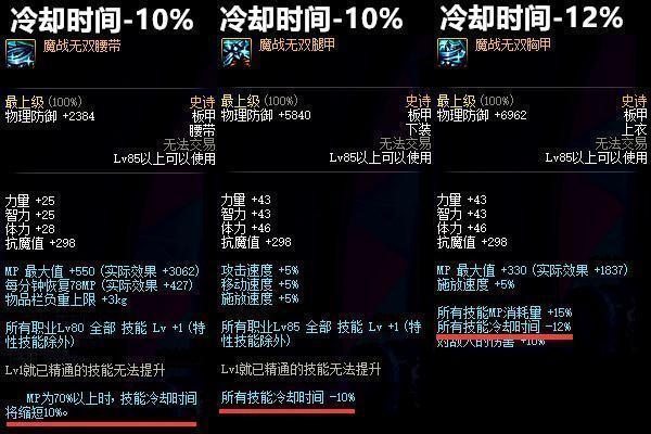 魔战腰带MP在70%以上时技能冷却时间缩短10%,魔战下装所有技能冷却时间-10%,上衣则是所有技能冷却时间-12%,魔战三件套32%减CD。