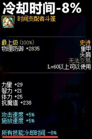 时间支配者头肩所有技能冷却时间-8%,这个装备可以通过新版神秘次元遗迹做出来,每周五和周日可以通关一次,一般情况下五周就可以做出来。魔战三件套+支配者头肩=40%减CD。