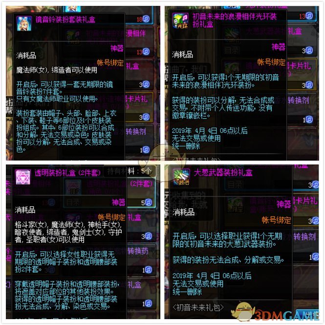 5个兑换透明装扮礼盒2件套,正好与初音6件套组成套装;