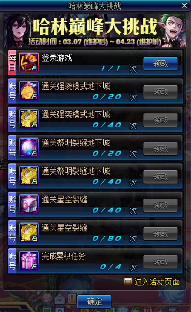 通关40次黎明裂缝获得1个哈林史诗装备自选礼盒;
