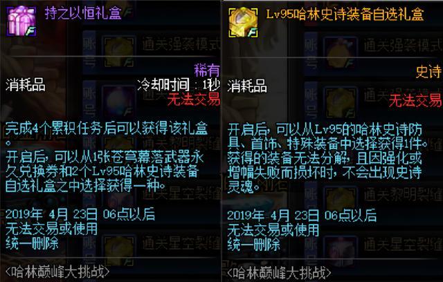 以上七个任务完成其中任意4个,可以获得累计奖励-持之以恒礼盒,礼盒开启可以选择获得1张苍穹幕落武器永久兑换券,或者是2个哈林史诗装备自选礼盒。