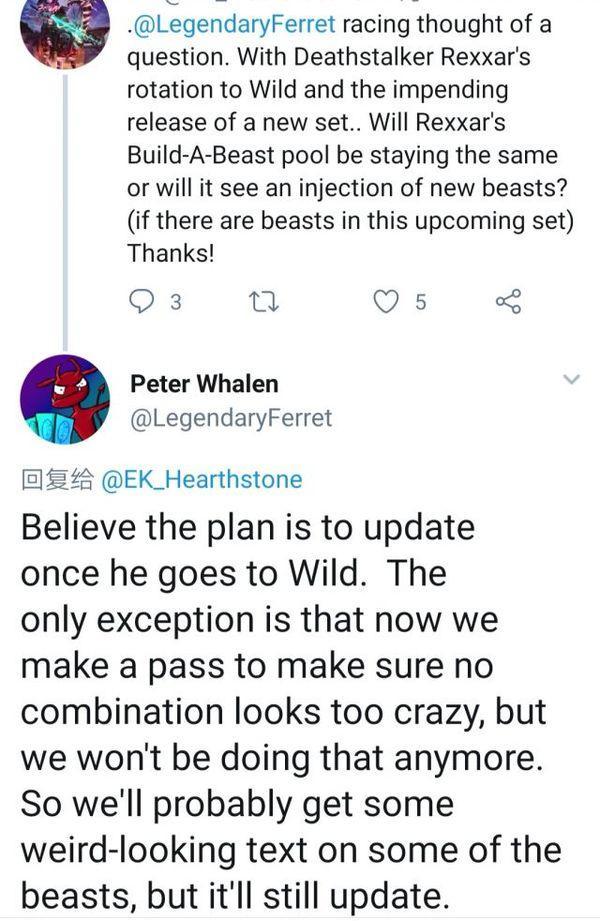 EK_Hearthstone:随着死亡猎手雷克萨退环境以及新扩展包的上线,雷克萨的僵尸兽野兽池会保持不变,还是会有新野兽加入(假设在新版本中有野兽)?Peter Whalen:在他进入狂野模式后我们就会立即更新野兽池。唯一不同的是,之后不会再人工排列调整卡面文字了。所以可能有些僵尸兽的文本看起来会不够美观,但总之野兽池还是会更新的。
