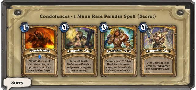 奥秘:当你的随从死亡时,你的对手须选择一张慰问牌交给你。