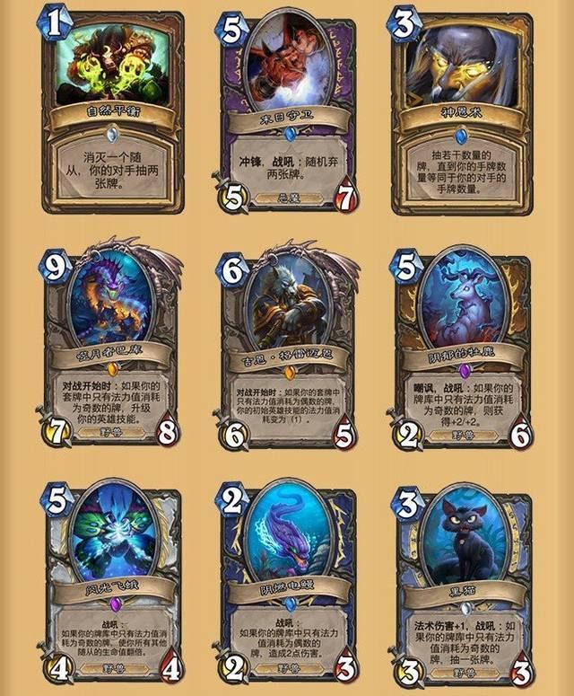 自然平衡对德鲁伊来说是一张强大而灵活的解卡,抽牌的副作用反而更多的用来爆对手的手牌了,可以说是基本没有副作用了。大部分的德鲁伊卡组都带了这张牌,其中在墙德、机克德等卡牌中甚至是核心卡牌。