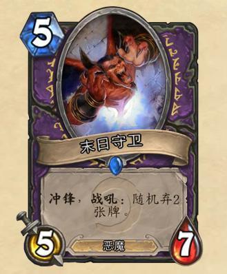 能被称为一个职业的大哥,肯定是能打的,末日守卫拥有557的身材和冲锋的关键字,在术士的橙武出现以后,副作用完全被忽略,和食肉模块配合以后完全是横扫一时。模块术自出世以后,便一直有它的拥护者。而这张卡提供给了术士返场同时造成大量伤害的能力,把他送进荣誉室就不可避免了。