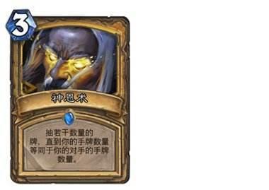 神恩术在快攻卡组中表现相当出色,抽到和对面卡牌数量一样吗,这种近乎耍赖皮的过牌方式,可以说是所有卡牌中最高效的过牌法术了。设计师将这张卡送入荣誉室恐怕是准备遏制一下圣骑士快攻的势头了。