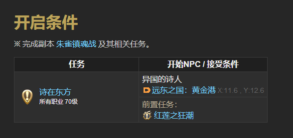 需要先完成副本“朱雀镇魂战”以及相关任务,并且角色等级到达70级,就可以在远东之国:黄金港X:11.6Y:12.6处接取异国的诗人任务,想要开启朱雀的玩家们,赶快去做前置任务吧。