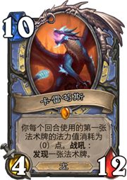 卡雷苟斯本身的身材依旧是龙族标准模型,费用增加了1,不过并不影响使用。而战吼效果自然没得说,免费赚卡差,一条龙换一个法术,还有无比强大的光环效果,对面一回合解不掉很可能就要连吃2个炎爆了。