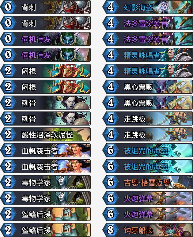 最佳的起手是血帆、毒物学家还是鲨鳍后援,可以保证2费刚好能够配合上1费挂的刀。前期以控场为主,中期通过海盗体系不断扩大场面,对战快速中速卡组,以抢夺场面为主,随从和火炮弹幕都可用以清场。面对较慢的卡组,则需要加快打脸速度,使用闷棍和走跳板来抢节奏,面对对手AOE节点适当留随从,有效利用伤害制胜。