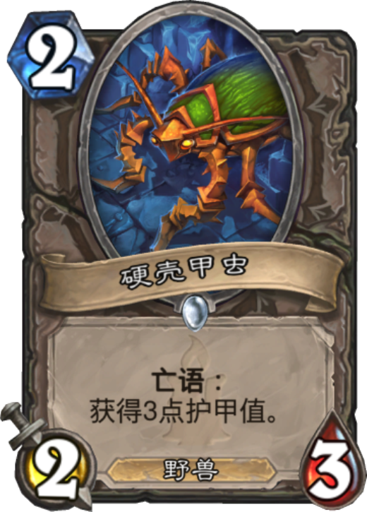 硬壳甲虫的属性和效果都朴实无华,是很多卡组前期的过渡卡,223的野兽非常泛用,加3护甲的亡语更是锦上添花,有些时候,这3点护甲也能改变比赛的结果。