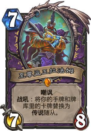 探险家协会的拉法姆会给玩家一张强大的10费神器牌,虽然使用的人不多,但是还算有创意。然而看看这次成为了至尊盗王的拉法姆,费用确实少了,仅从身材来看不算亏,但是这个特效么,真的有点炒冷饭的嫌疑,不就是探险家协会挖宝后的黄金猿效果吗?
