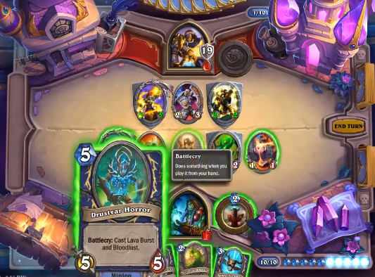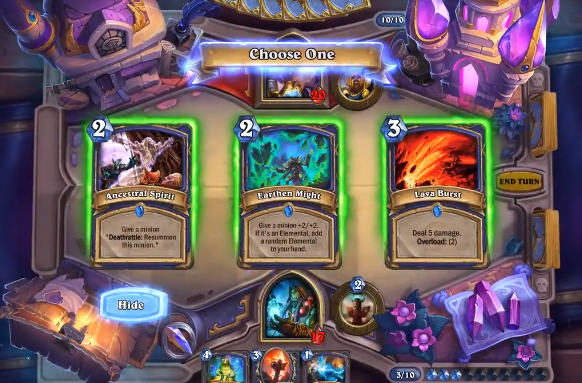 这个教的过程就是随机发现一个萨满的法术,一共可以发现2次,当打出这个随从的时候这2个法术就会生效,由于这个随从的费用是5费,相当于是白赚了2个法术了,而这个法术和其他随机释放的不一样,由于2个法术中最多只能发现一个指向性的法术,所以在打出去的时候可以选择目标,那自然就只有正收益了。