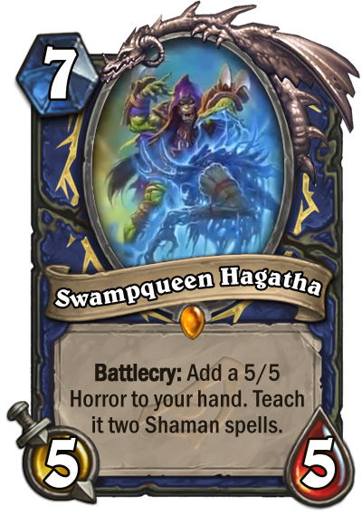这是一张萨满的传说卡:沼泽女王哈加莎,7费55的身材,看上去有点亏,但效果非常不错,是将1张身材为55的随从加入你的手牌,还会教他2个萨满的法术。