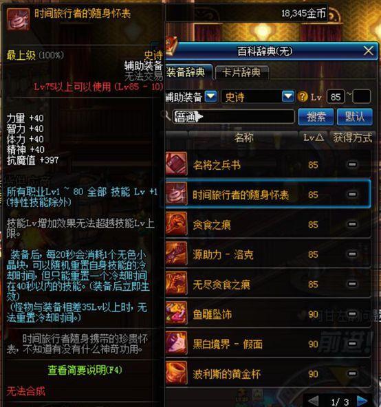 其次是时间旅行者的随身怀表,在90版本之时,他就被作为强散闻名于地下城,不仅是因为它能够重置技能,更是因为其对1-80级技能各增加一级的特殊效果,让它广受欢迎。在如今全民海伯伦的时代,秒表依旧可以作为强力换装道具存在于包裹中。