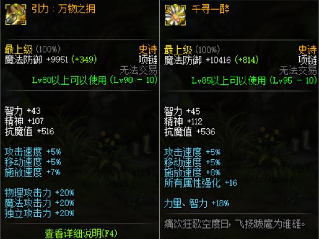 两个项链的速度不作为提升率的分析,毕竟速度加成差不多,千寻一醉多了1%的释放速度,速度的差距。所以我们只考虑三攻的属性提升和力量属强的提升。