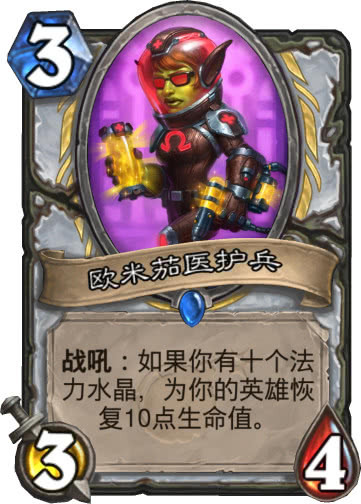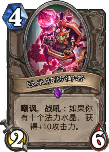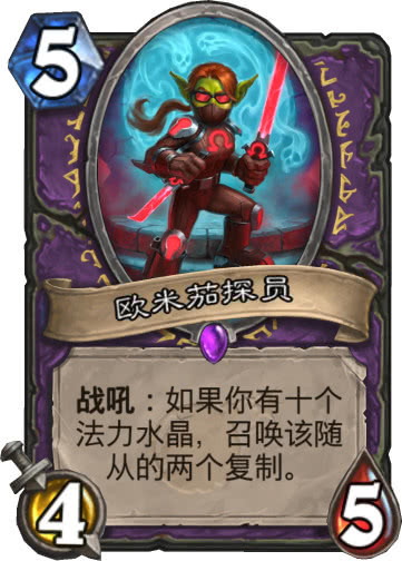 欧米茄毁灭者拥有4-4-5的标准属性,跟基础卡牌的冷风雪人一样的属性,关键时刻可以在四费的时候作为一张白板上场,而且欧米茄毁灭者还多了一个机械随从,可以跟磁力形成联动。如果当你拥有十颗法力水晶,欧米茄毁灭者还能触发强大的战吼效果,对一个随从造成高达十点的伤害,简直就是不能打人的炎爆术!能有几个随从能够顶得住欧米茄毁灭者的战吼呢?