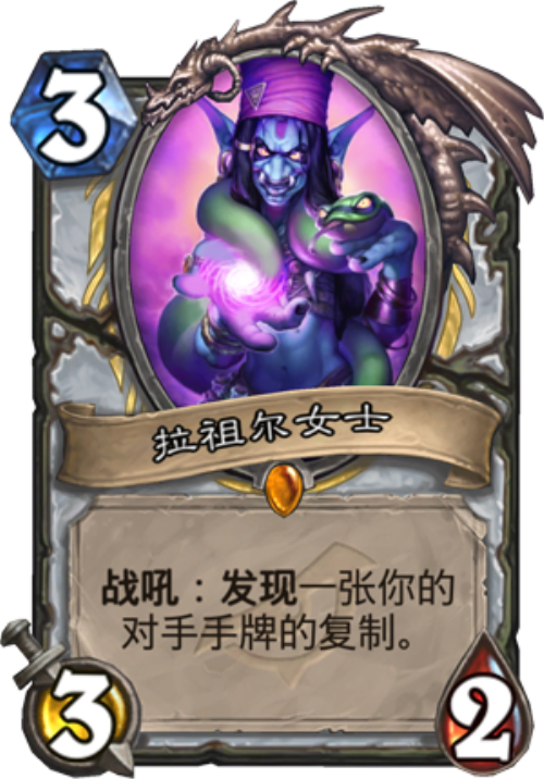 332的身材,感觉是亏了1费,战吼效果发现一张你对手手牌的复制,也是一张偷牌卡,但和其他的随机偷牌相比,这个发现无疑是强了很多,不仅可以选择自己想要的牌,还能得到对面手牌的信息,如果对手的手牌是3张或以下的话,那自然所有信息就暴露无遗了,对牧师接下去的打法有很大的帮助。
