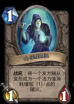发现一张法术;毫无疑问最强的跟班,无论是找单解、找aoe、找直伤都是有机会的,而且成本只要1费,发现3选1,有时候比抽一张卡找法术来的更优质;加上是额外的,那么就可以突破一套牌2张的限制,使出第三张,打对手一个措手不及,另外比较期待的是:没有注明只能发现本职业的,或许是整个标准卡池的法术也不一定呢!