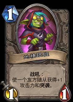 ②跟班卡的随机性,我们知道一共5个1费1/1,效果分别是:造成2伤、使一个友方随从变成高1费随从、召唤1个随机2费、发现一张法术、使一个友方随从获得+1攻和突袭。之所以劣势场面不要搏“跟班”还有一个原因就是随机性,劣势我们做的动作肯定是为了缓解场面压力的,而随机性经常会让我们得不到想要的那个跟班,反而浪费了费用,失去了解场的机会(特殊情况:其他手牌都不能救的时候,也只能搏了)