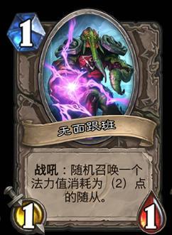 随机召唤一个2费随从;这张卡是最有争议的,对于控制卡组而言,理论上是5张中最差的一张,但是万一出末日预言者了呢?好像还真有用。而对于快攻而言肯定是优质的,1费可以有1/1+一个2费的站场,铺场能力爆表,但是万一出末日预言者了呢?所以这张卡可以说是“成也末日,败也末日”