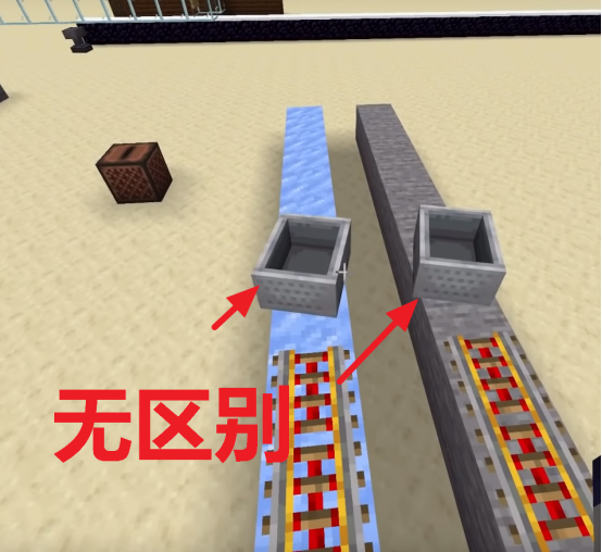 我的世界矿车离开铁轨之后也会滑动一小段的距离,于是就有玩家想到了矿车在冰面上会不会滑行的更远,然而经过测试却发现我的世界中并没有这样的设定,两个矿车都是在相同长度的充能铁轨上被一同触发的,但是它们两个的滑行距离确是一样的长,有此可见我的世界中并没有设定这个细节。