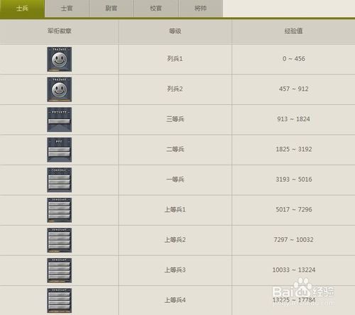 士兵军衔是从列兵1到上等兵4,这个区间等级所要经验不多,特别好升级。