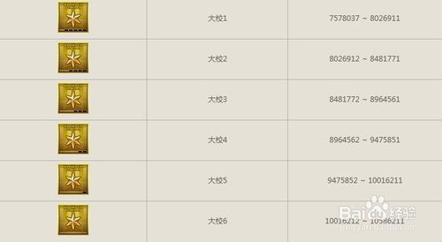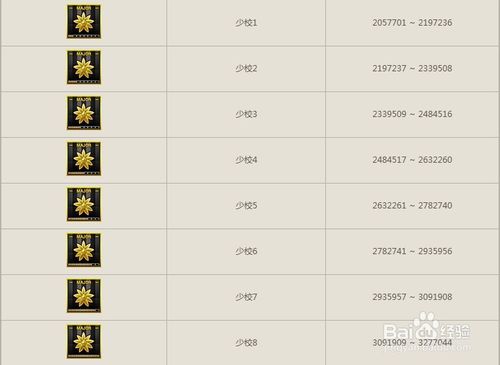 校官军衔分别为少校,中校,上校,大校四个阶段,前三个阶段为八等,后一个为六等。经验需要蛮多的,较难升级。