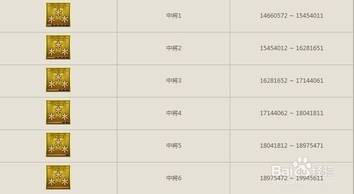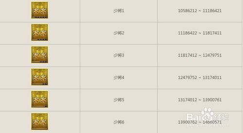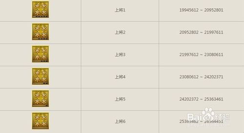 将帅军衔分别为少将,中奖,上将,元帅。其中少将中将和上将分别是六等。元帅在前边已经说过,就不再说了。这阶段经验要的超级多,升级困难……
