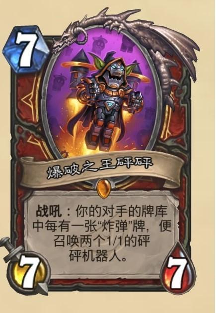 在经历过地精大战侏儒之后几个版本的炉石玩家们一定体会过砰砰博士的两个砰砰机器人的厉害。除了能够解场以外,砰砰机器人的伤害打到脸上也是很疼的。而爆破之王砰砰很有可能一下能够召唤6个砰砰机器人(对手牌库中三个以上"炸弹"牌即可),对手既要处理场面上的7-7随从和砰砰机器人还要保证自己的血量不被后面抽到的炸弹炸死,这可以说是非常困难了。