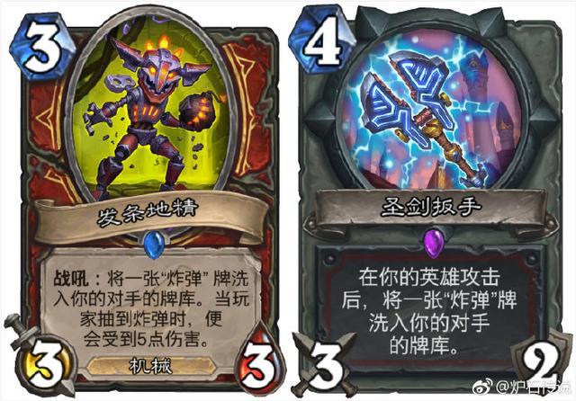 发条地精和圣剑扳手从牌面描述上来看就是"炸弹"体系中的强力卡牌。发条地精虽然身材略亏,但是其机械的属性再加上它的战吼效果,这张牌可以说非常强大,而且它的费用比爆盐投弹手低,非常灵活;圣剑扳手作为一张武器牌攻击力在4费这个费用上显得略低,但是其效果非常imba,这把武器砍完就可以埋两张"炸弹"牌进入对手的牌库,甚至可以配合"升级!"多洗一张"炸弹"牌。