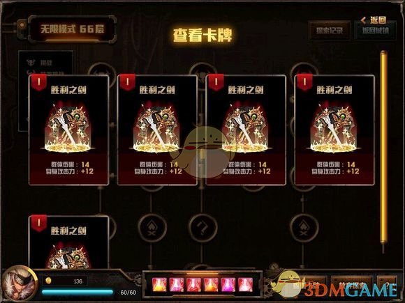 最后说一下这个游戏的玩法,相信很多玩家应该还历历在目,这个小游戏有一张bug级的牌就是胜利之剑,只要有见到这种牌是必选的,三张升级后的胜利之剑打下去,没有哪只怪是能活着的。三张胜利之剑伤害14+26+38=78点的群体伤害,这谁顶得住呢,啊哈哈。