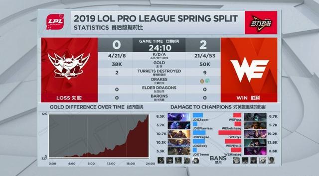 兮夜的妖姬在小规模作战中有多次天秀表现,虽然JDG中期作战能力强,但是每一次作战几乎都是被迫开团,团队脱节严重,被妖姬抓到机会各个突破。20分钟,WE兮夜妖姬直接满层杀人书,基本上能在团战开始前就秒杀JDG一员大将。这导致JDG有力无处使,局面根本拖不到JDG双C收割,便被碾压,只能遗憾输掉比赛。
