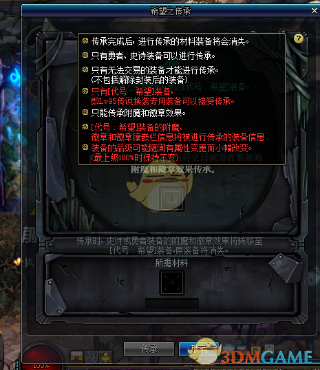 国服独有系统“附魔转移”在体验服更新了,官方命名为"传承",他的功能就是可以把史诗或者勇者套装的附魔/徽章直接转移到新的换装传说装备里面,就可以减少一些打造成本,只有95传说换装可以接受传承