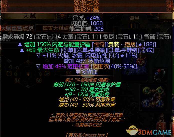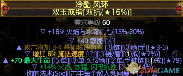 补血补抗补ES,伤害随缘。戒指要么选择督军印记吸血,要么选择塑界的法师击中回15血。因为我们这个BD,每秒HIT数能上百,所以击回15比吸血还猛。我双持+项链的电伤吸血。回的飞起