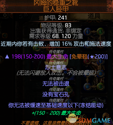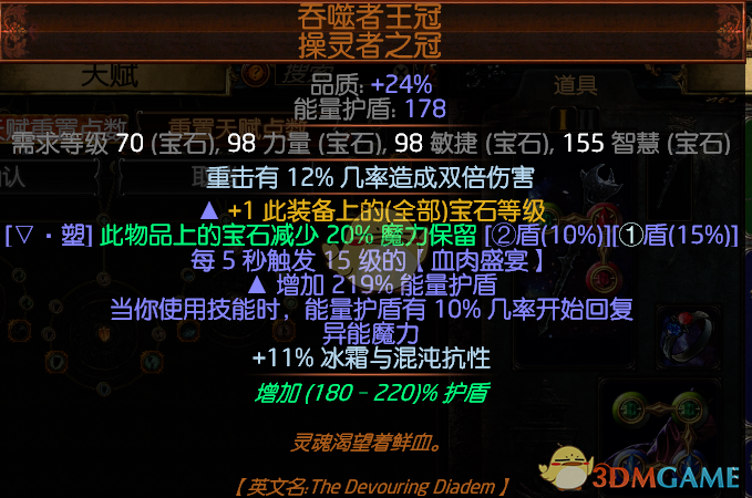 可以用黄装,这个头主要是减魔力保留,异能魔力可以不用担心蓝不够,配合MOM也不怕ES浪费。附魔选择裂风雷球15%几率额外一个球,我自己没跑出来。头部就是补血补ES补抗 或者化石做减抗光环的那个词缀。吞噬者王冠可以多开一个光环,雷霆或者憎恨,然而我开了纪律
