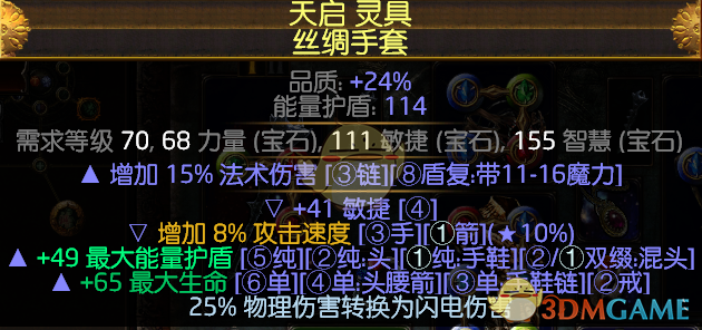依然补属性,后期附魔物理转元素配合天赋,可以把物理转闪电的辅助宝石换掉。后期附加伤害的转装备多了后,这个辅助宝石的伤害收益只有20%不到,而一颗辅助宝石的平均水平也在40%左右,所以换了伤害能有很大提升。
