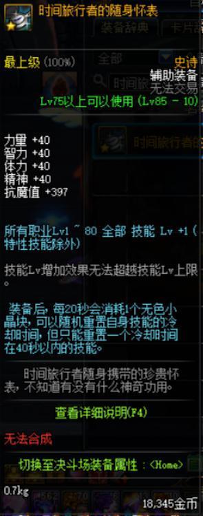 时间旅行者的随身怀表是网络游戏《地下城与勇士》(DNF)中各职业使用的一件史诗级辅助装备。装备效果是每20秒回消耗1个无色小晶块,以随机重置自身技能的冷却时间。