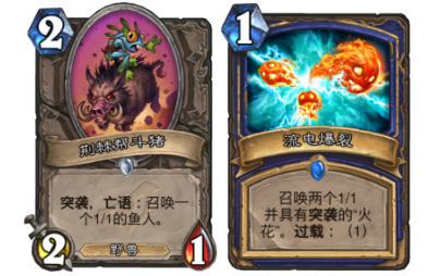 这两张放在一起说,斗猪这张卡我是替换掉了本来给蓝腮的位置,221突袭可以在前期迅速抢占节奏,亡语给的板娘也是我们非常需要的鱼人,我选则了满编。流电爆裂也是作为一个前期抢占攻击频率的卡位来携带,但由于过载的原因,本身可能不是一个一费下的卡,但是效果依然很给力,这两张卡在配合嗜血和洗脚的时候也有着不俗的表现。