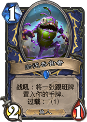 这张卡我觉得是跟班相关卡里面最棒的一张卡了,五张跟班都很强力,121身材还是鱼人也非常契合鱼人体系的思路,唯一的缺点就是过载一费,虽然跟班会抢回来节奏,但是在我觉得他不是一张适合一费直接下的生物,但是大多数情况这张卡的收益要更大一些。