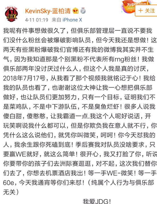 最近LOL的电竞圈内,大大小小的节奏就没停止过,粉丝之间的撕逼随处可见,就连战队队员们也被连带了进去,就在4月11日的凌晨,又发生了一件大事,JDG的老板在深夜突然的Diss起WE的微笑了。