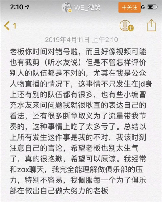 最后JDG老板也删除了diss微笑的微博,不过这时候做了一个让人哭笑不得的操作,就是JDG老板也为自己这样突然diss的莽撞行为向微笑道歉了,感觉也是一时上头才会diss微笑,也希望这样的事情以后少点。